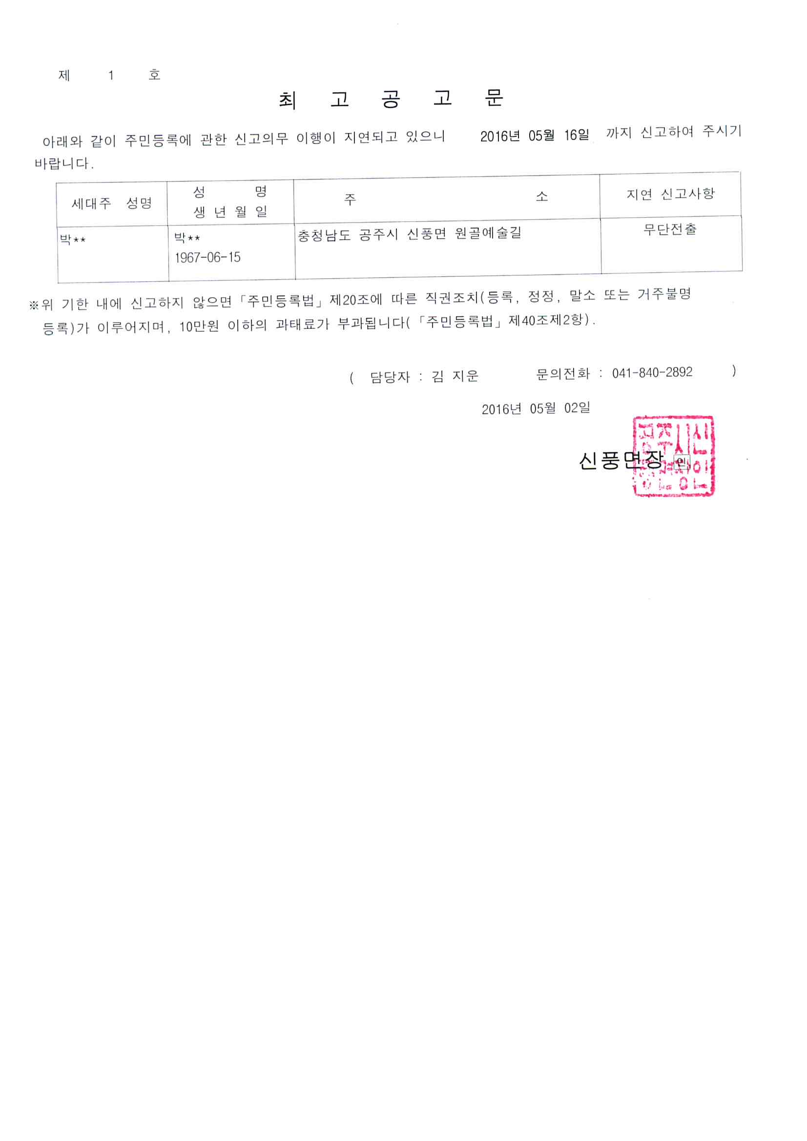 | 251 | 주민등록 최고공고문 (박**) | 신풍면 | 632 | 2016-05-02 | 최고공고문.jpg |