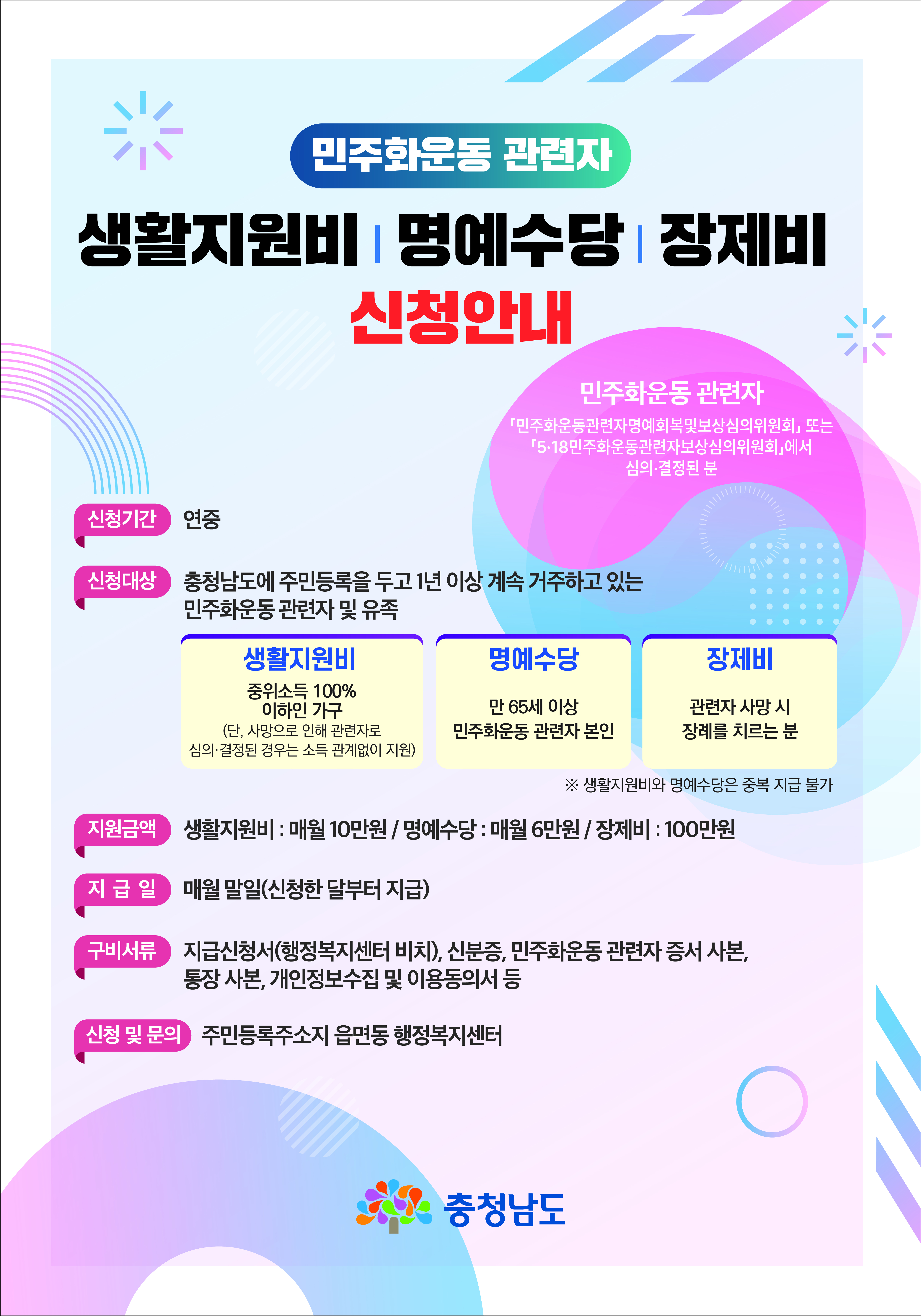 | 872 | 민주화운동 관련자 생활지원비ㆍ명예수당ㆍ장제비 지원사업 홍보 | 신풍면 | 22 | 2023-02-15 | 포스터.jpg |