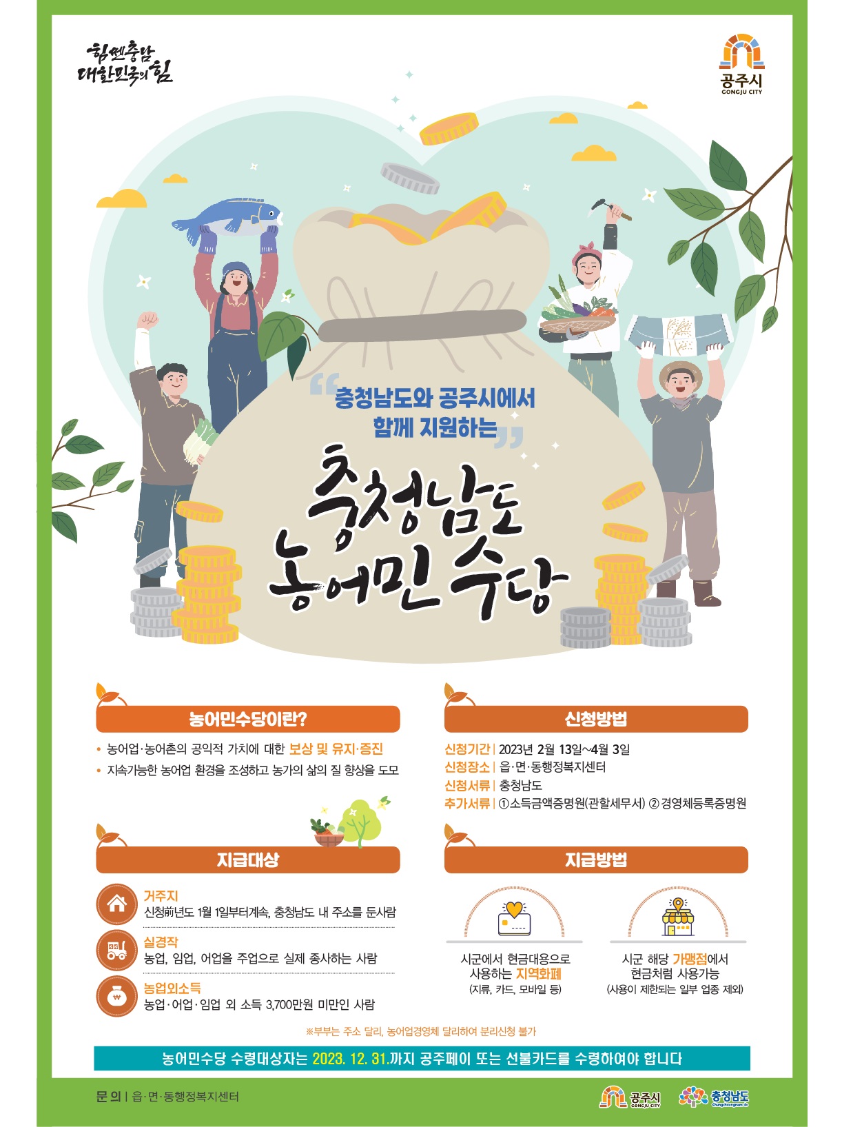 | 439 | 2023년 충청남도 농어민수당 신청 안내 | 중학동 | 93 | 2023-02-15 | 농어민수당_포스터.jpg |