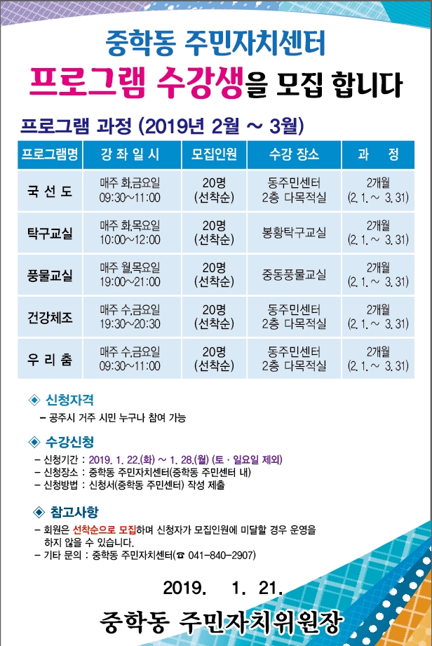 | 245 | 2019년 중학동 주민자치센터 프로그램 수강생 모집 | 중학동 | 276 | 2019-01-17 | 2019주민자치센터 수강생 모집.jpg |