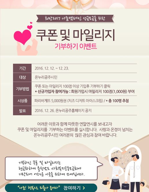 | 148 | 희망2017 나눔캠페인 성금 모금을 위한 쿠폰 및 마일리지 기부하기 이벤트 안내 | 중학동 | 626 | 2016-12-14 | 홍보문.JPG |