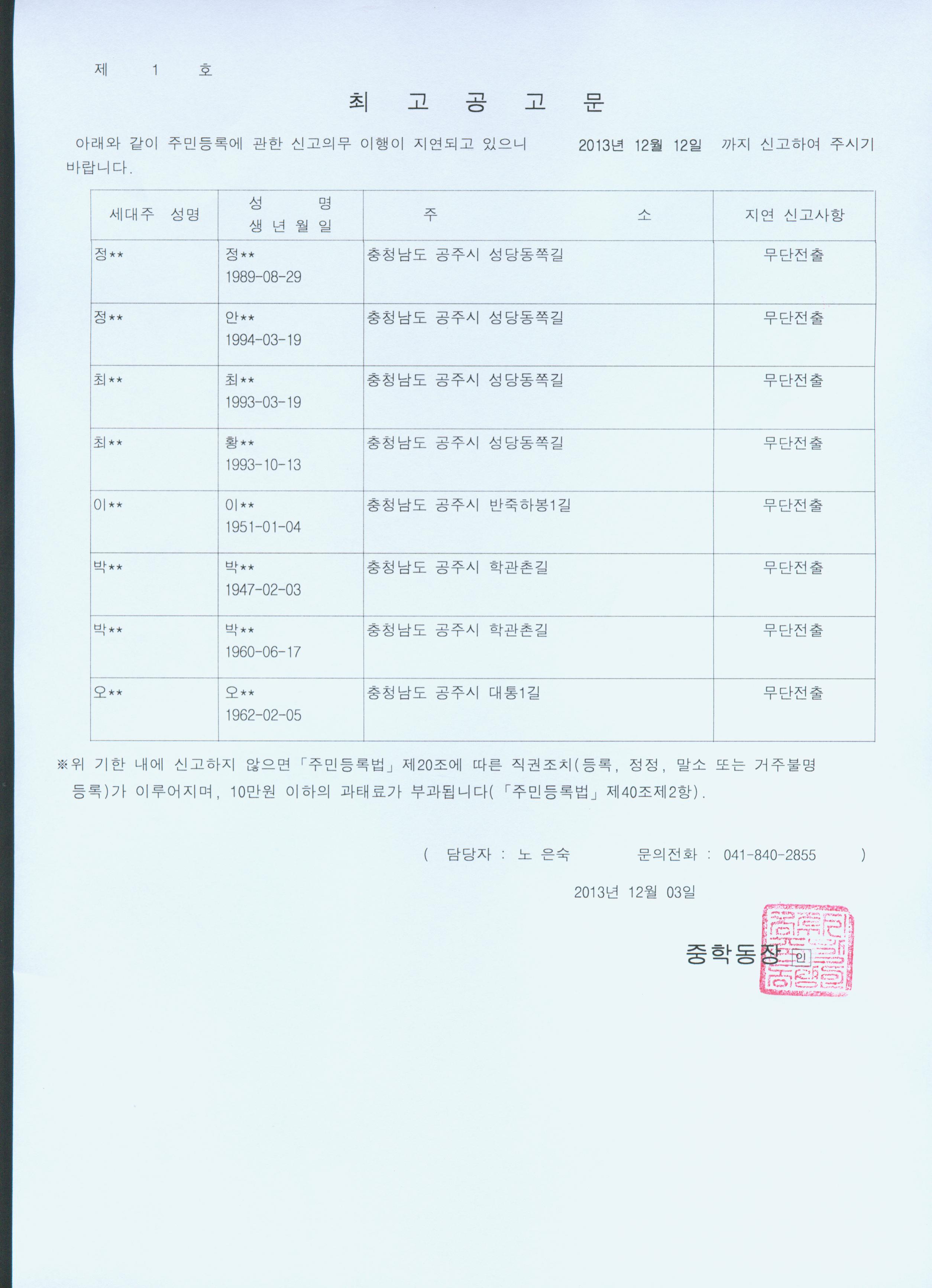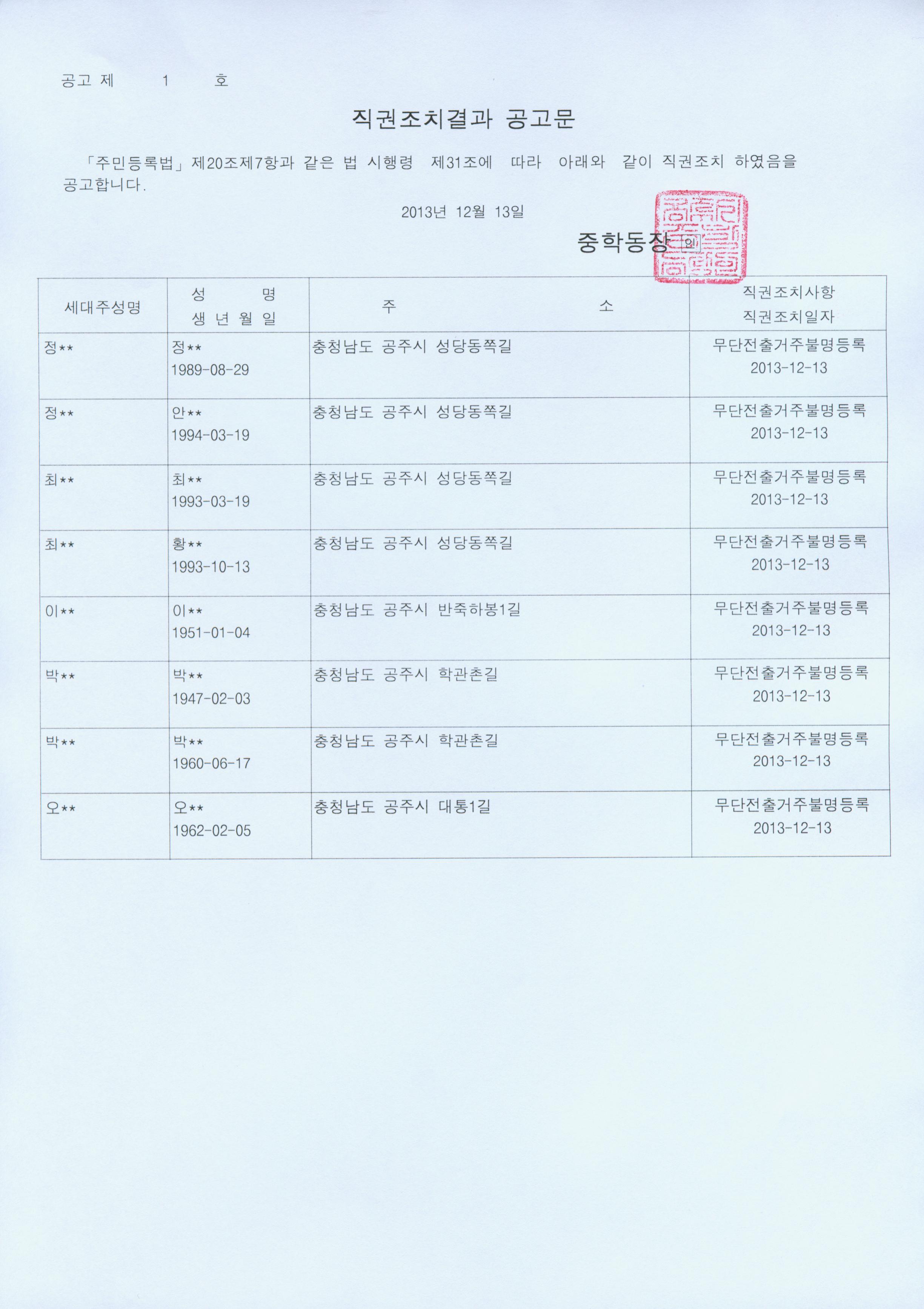 | 74 | 주민등록 무단전출자 직권조치 및 공고 | 중학동 | 1,279 | 2013-12-13 | 직권조치결과 공고문.jpg |