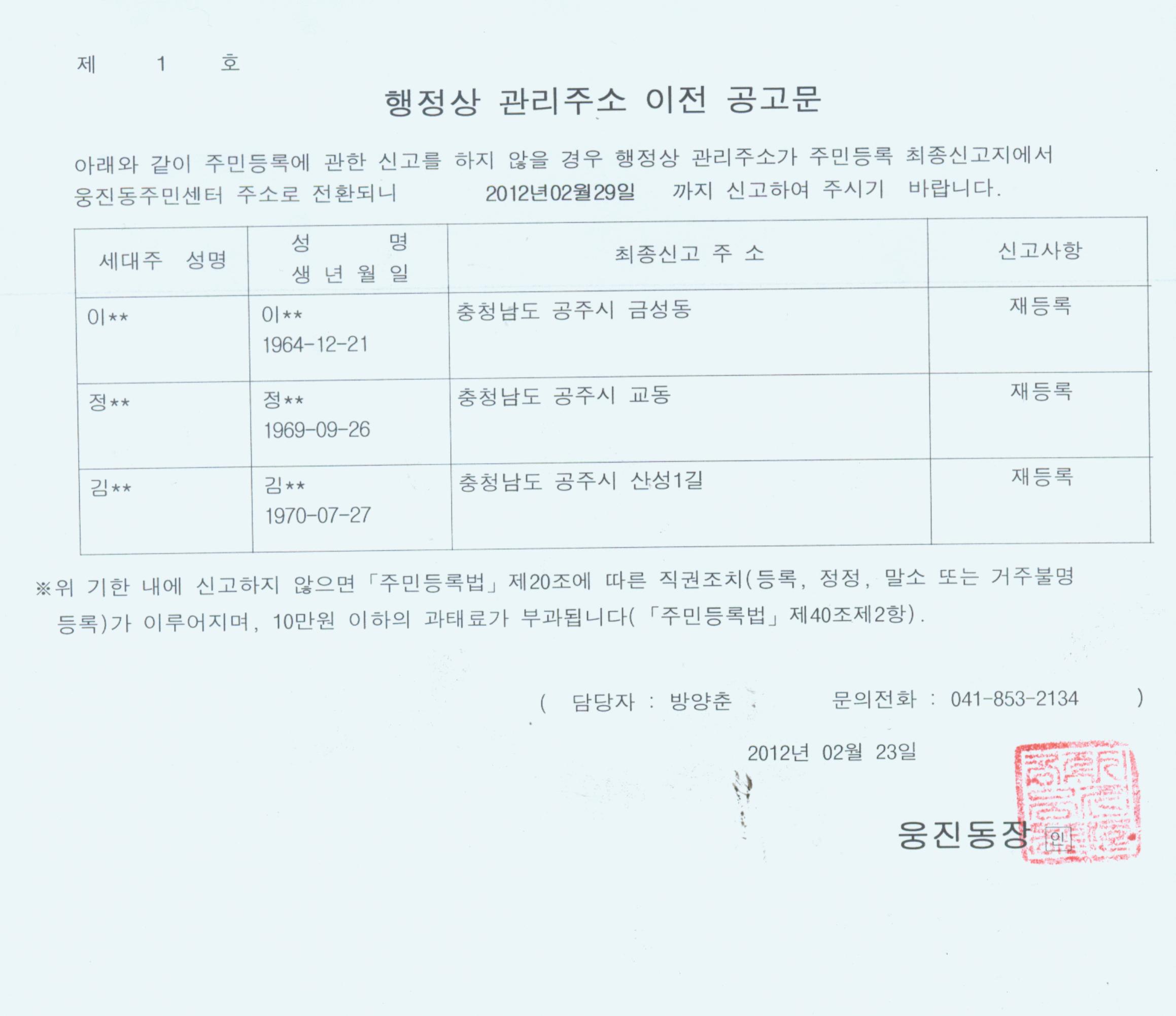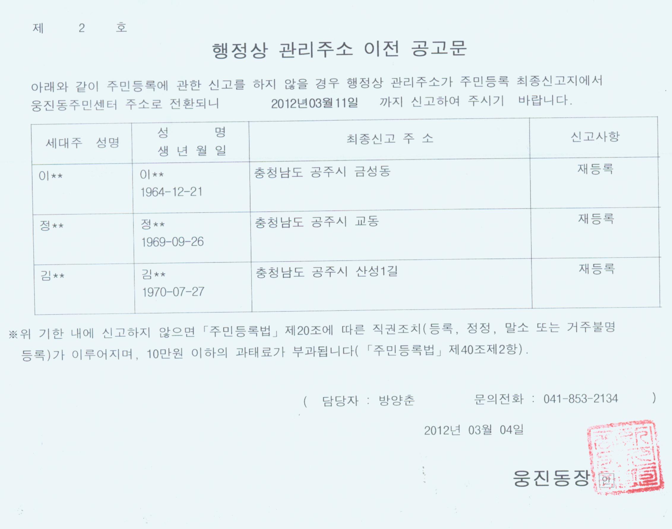 | 306 | 주민등록 거주불명등록자 행정상 관리주소 이전 공고 안내 | 관리자 | 527 | 2012-03-04 | 주민등록 행정상 주소이전 공고002.jpg |