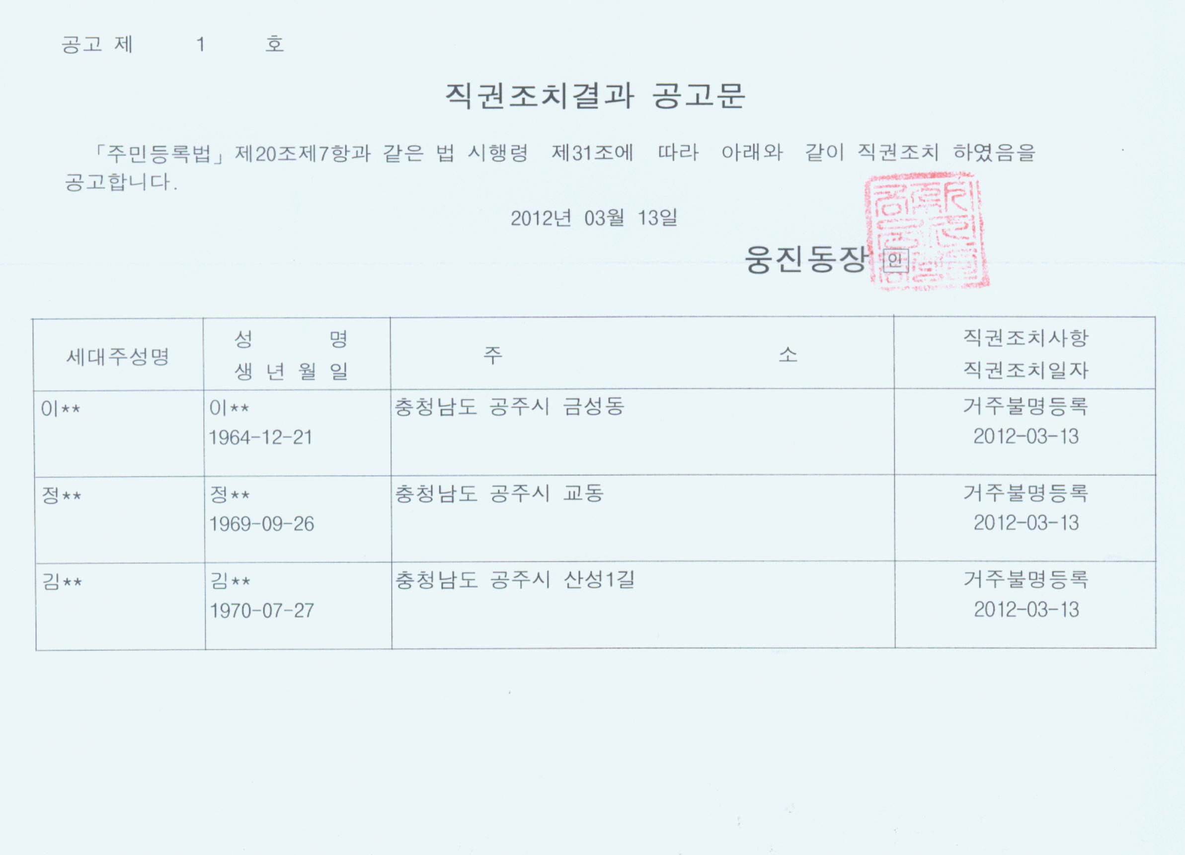 | 307 | 거주불명등록자 행정상관리주소 이전 직권조치결과 공고 | 관리자 | 528 | 2012-03-13 | 직권조치결과 공고문(거주불명등록자행정상주소이전).jpg |