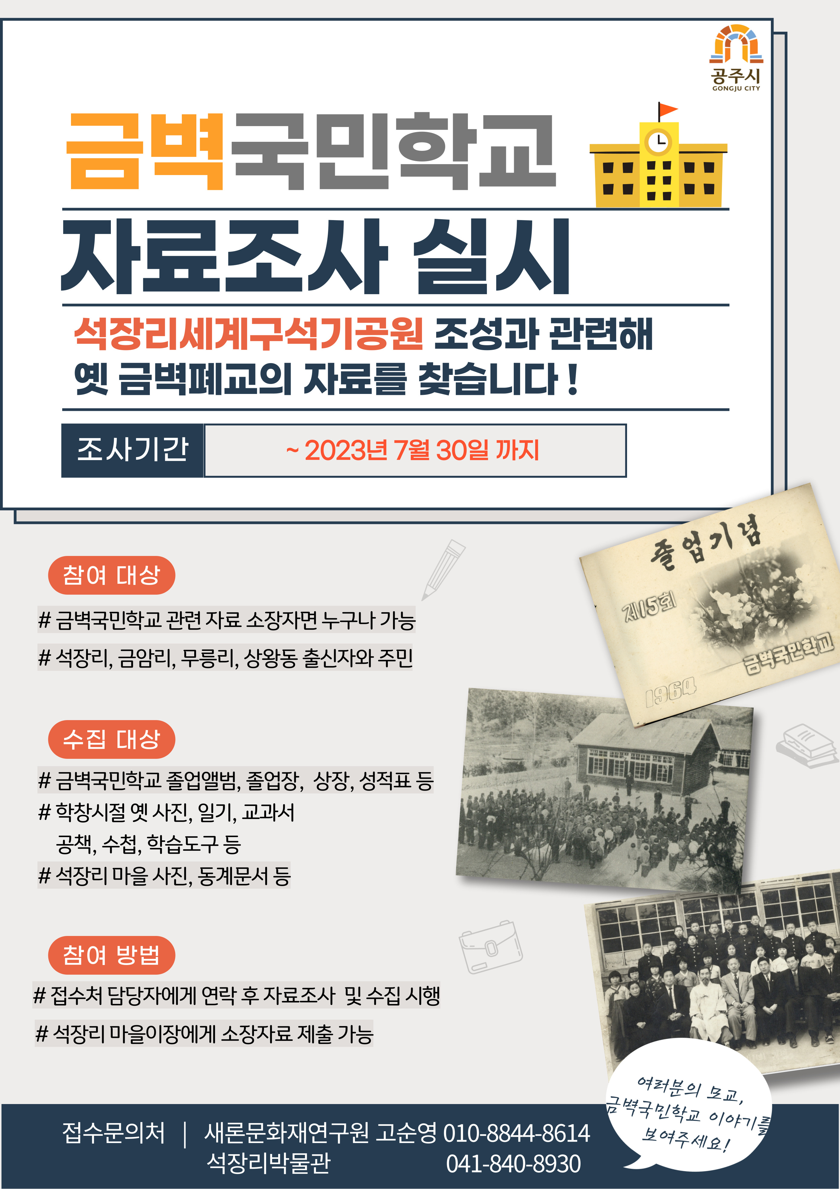 | 693 | 공주 금벽국민학교(금벽분교) 관련 아카이브 자료 조사 홍보 | 옥룡동 | 107 | 2023-06-13 | 금벽폐교 자료조사 포스터 (1).jpg |