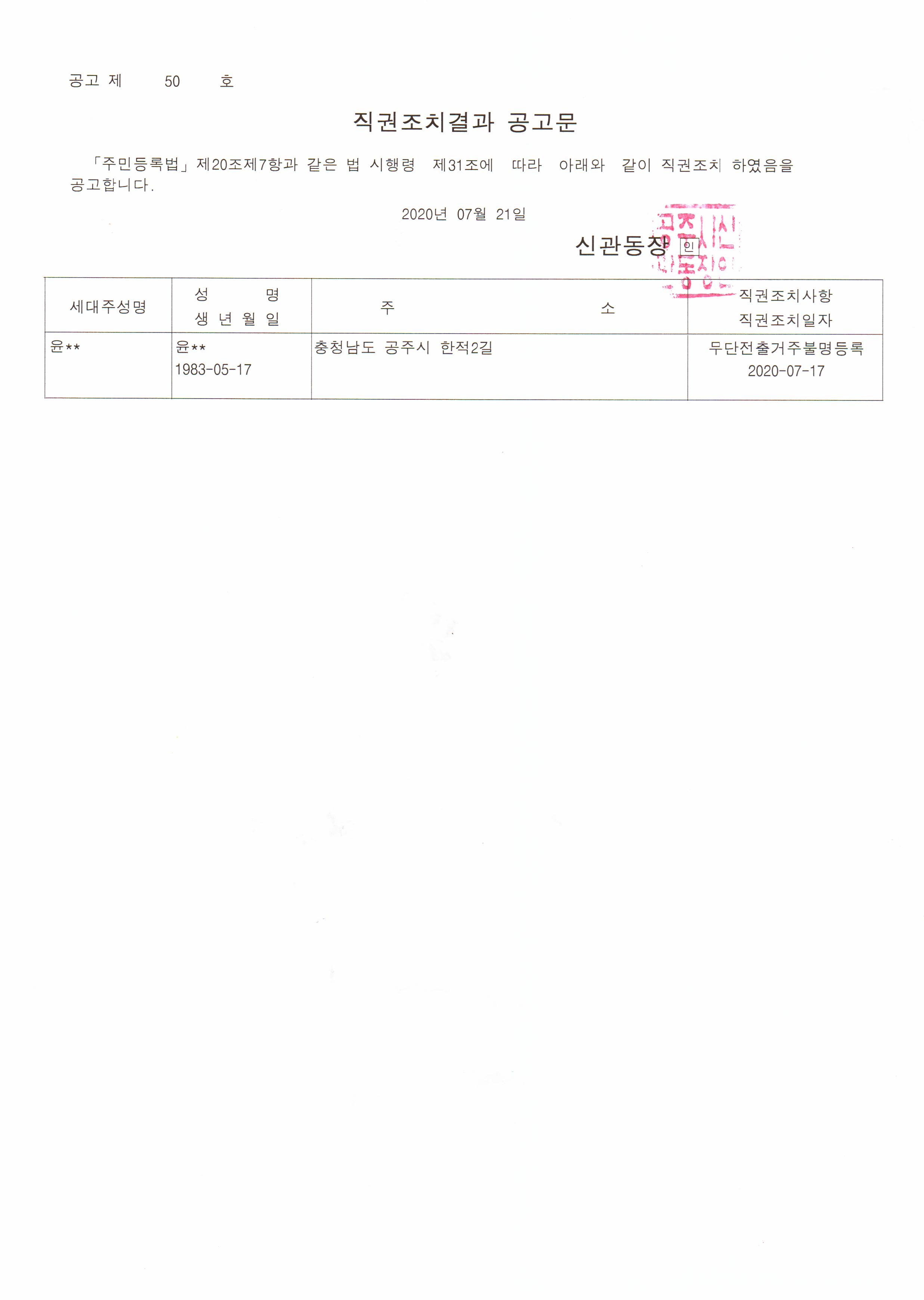| 577 | 주민등록 거주불명등록 직권조치 결과 공고 | 신관동 | 42 | 2020-07-22 | 공고제50호.jpg |