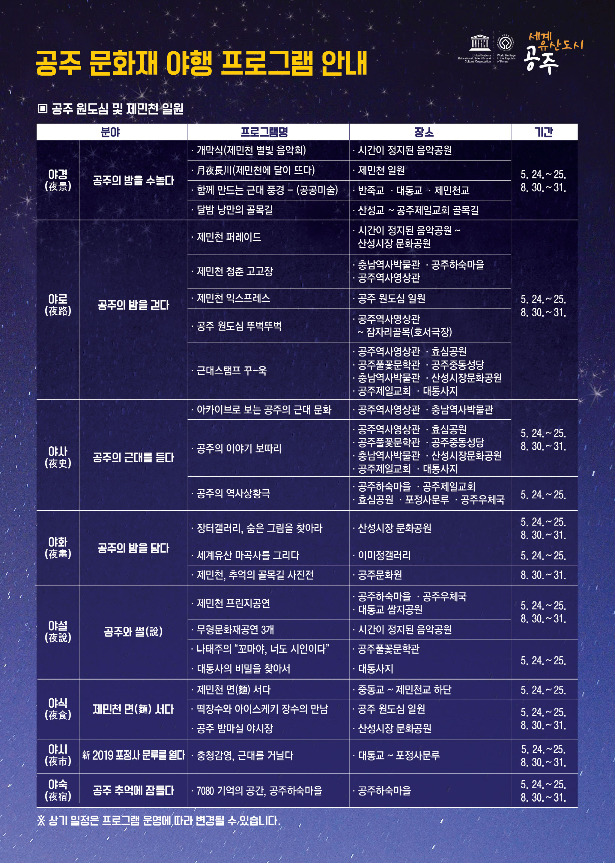 | 406 | [5. 24.(금)~5. 25.(토) 18시~23시] 2019년 공주 문화재 야행 홍보 | 신관동 | 48 | 2019-05-09 | 공주문화재 야행 프로그램 안내.jpg |