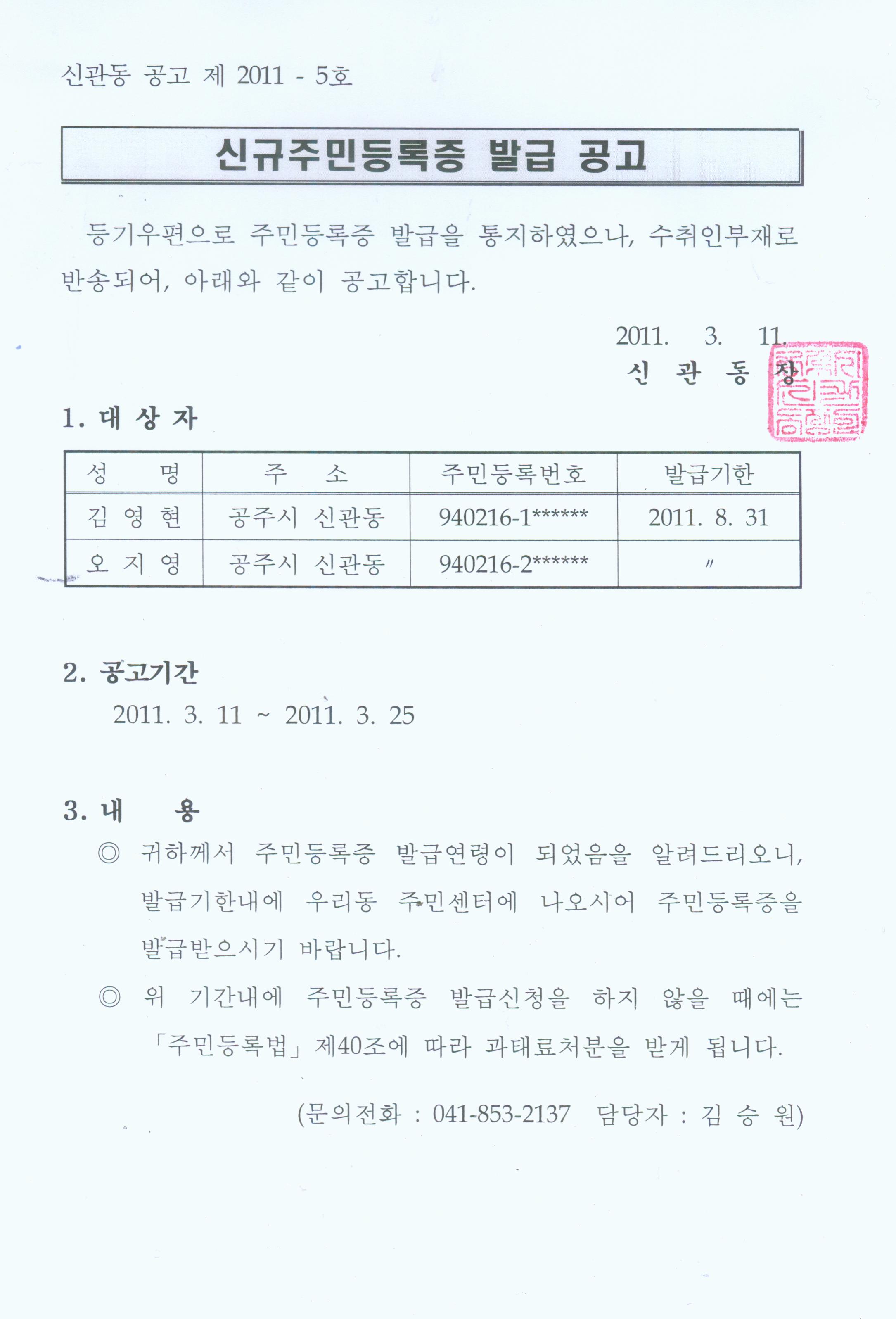 | 33 | 신규주민등록증 발급 안내문 반송자 공고(94년 2월생) | 관리자 | 724 | 2011-03-11 | 주민등록증 발급 공고(2011년 2월).jpg |