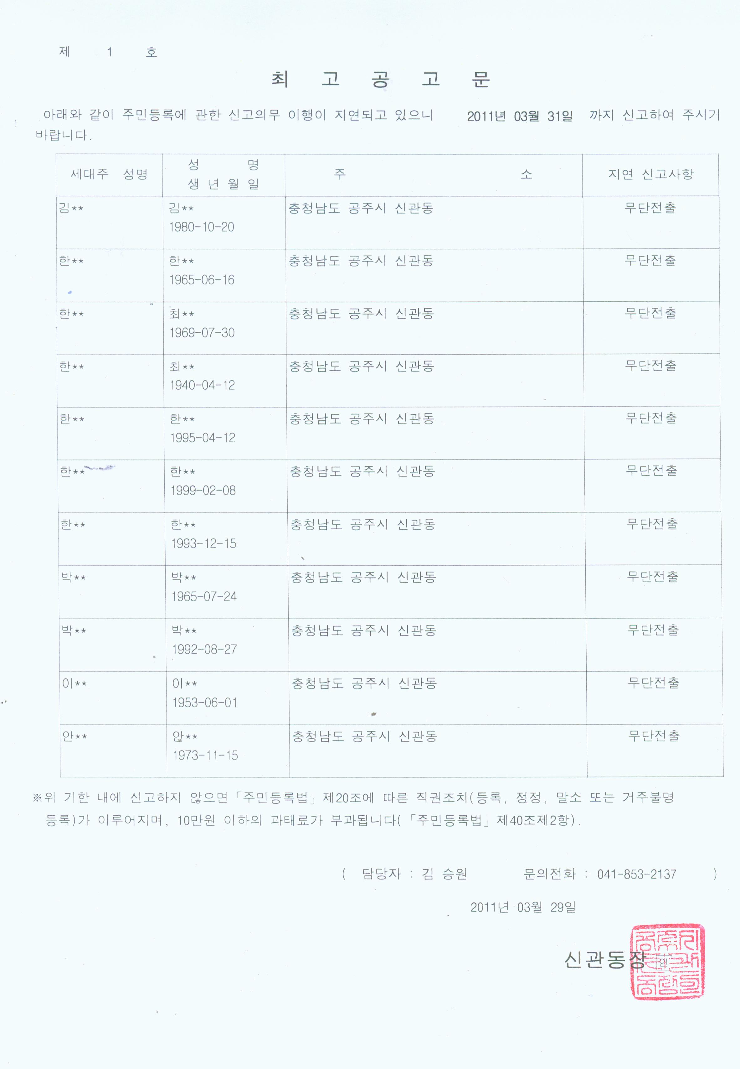 | 34 | 2011년 주민등록 일제정리 무단전출자 최고공고(수정) | 관리자 | 733 | 2011-03-17 | 2010년3월29일 최고공고문(수정).jpg |