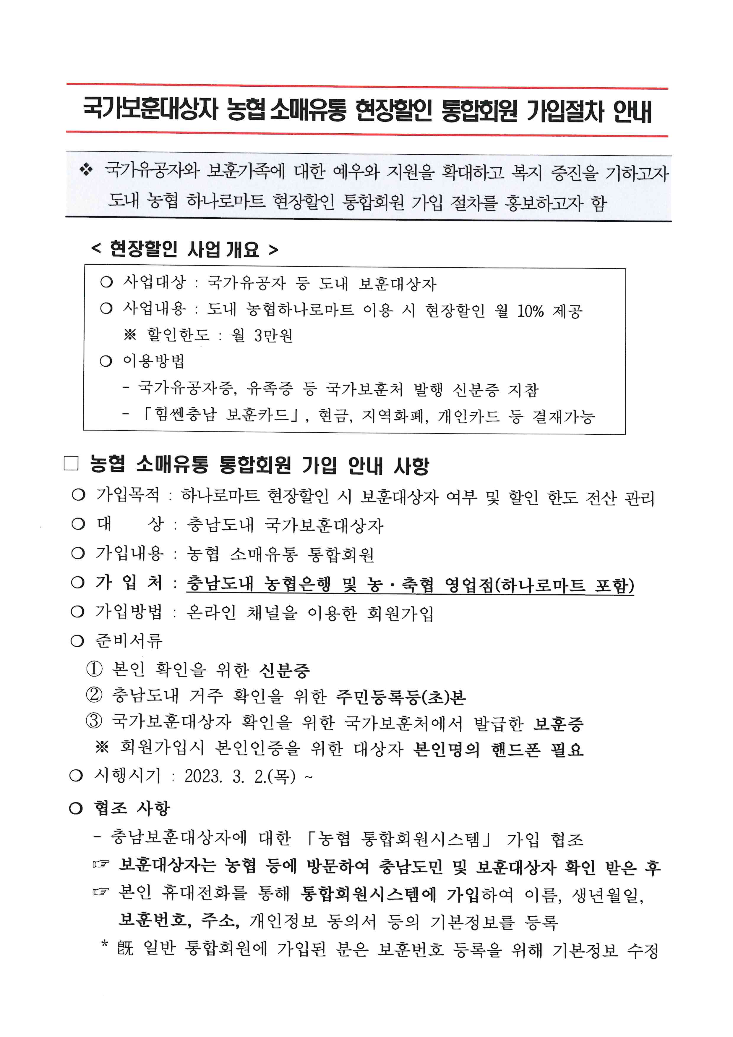 | 978 | 국가보훈대상자 하나로마트 현장할인 통합회원 가입 협조 및 홍보 안내문 | 신관동 | 355 | 2023-09-08 | 보훈대상자 하나로마트 현장할인 통합회원 가입 안내문.jpg |
