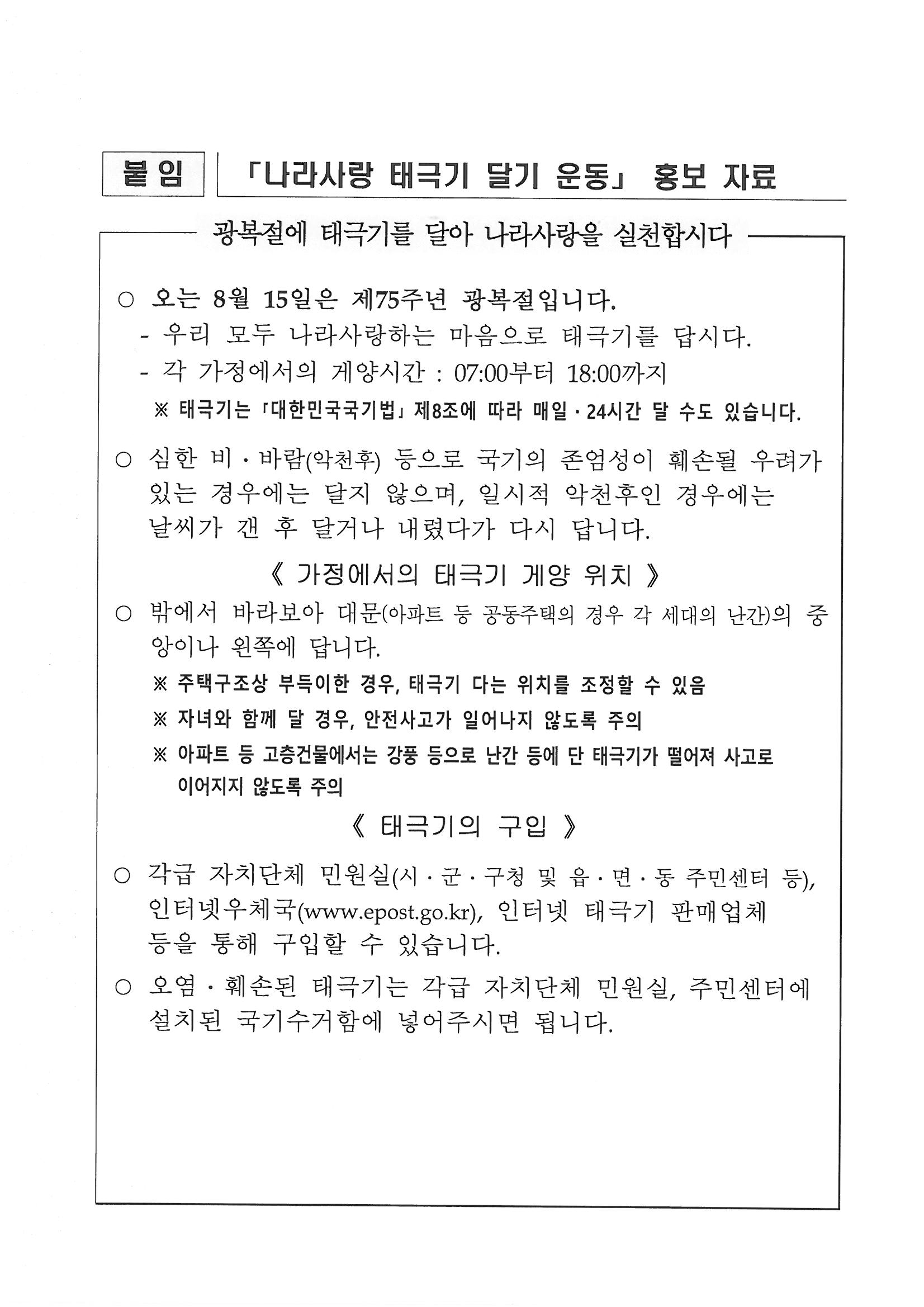 | 7369 | 제75주년 광복절 「나라사랑 태극기 달기 운동」 추진 | 유구읍 | 177 | 2020-08-06 | 제75주년광복절태극기.jpg |
