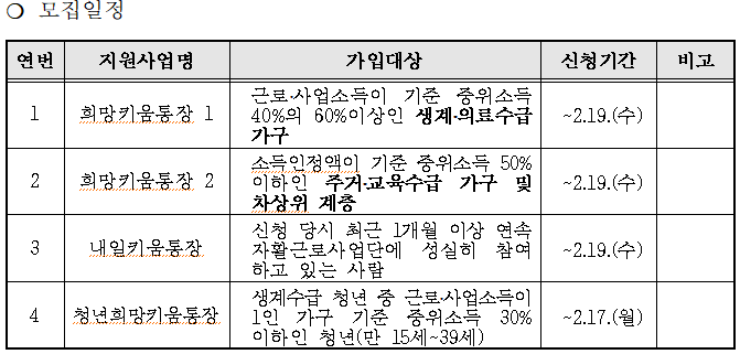 | 6884 | < 2020년도 자산형성 지원사업 가입 및 모집일정 안내 > | 금학동 | 35 | 2020-02-11 | 희망키움.png |