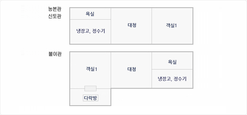 입실은 15시 이후이며 퇴실은 11시까지입니다. 신토관은 초가형입니다. 예약 취소시 사용예정일 5일전 취소는 전액환급, 이후에는 위약금이 발생하오니 신중한 예약 부탁드립니다. 기준정원 초과 시 1명 10,000원을 추가납부 하여야 하며, 초과인원은 1인 이하로 제한합니다. 퇴실시간 초과 시 사용료:12:00 까지 10,000원(1시간만 추가사용가능), 12:00 이후 퇴실 시에는 1박 사용를 추가 납부해야합니다. |
