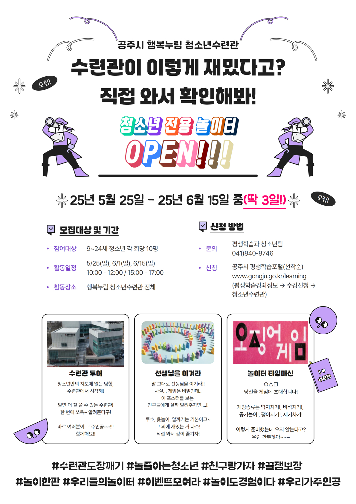 | 강좌명 | 수련관 투어, 선생님을 이겨라!, 놀이터 타임머신(오후반) | 교육기간 | 2025-06-15~ 2025-06-15 |