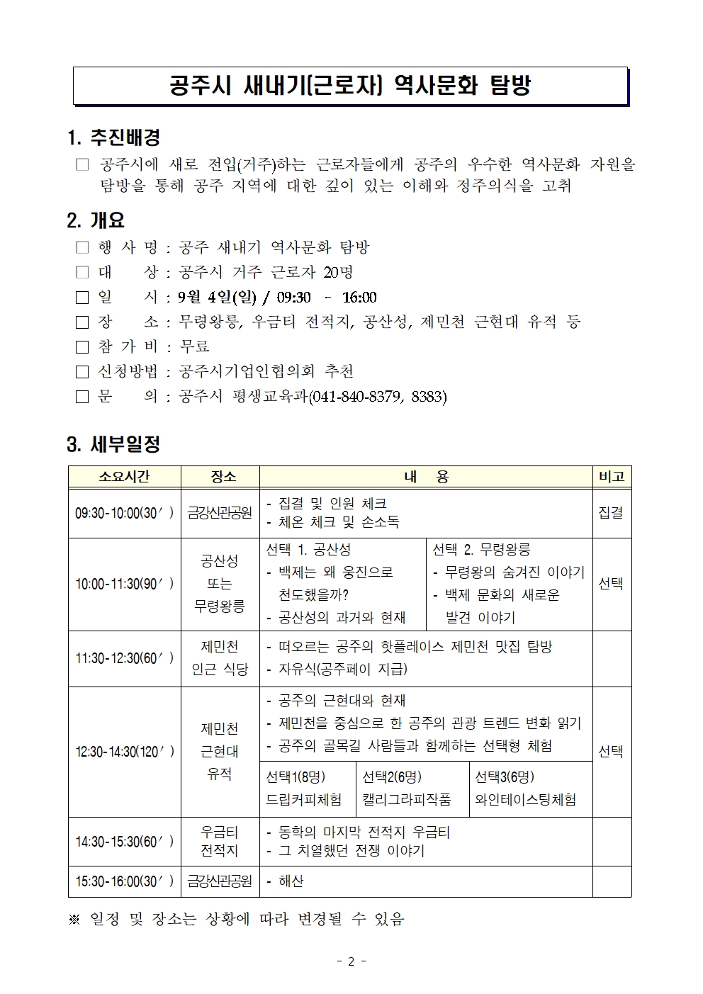 교육장소 공산성, 무령왕릉, 공주 골목길, 우금티전적지 등 정원 20