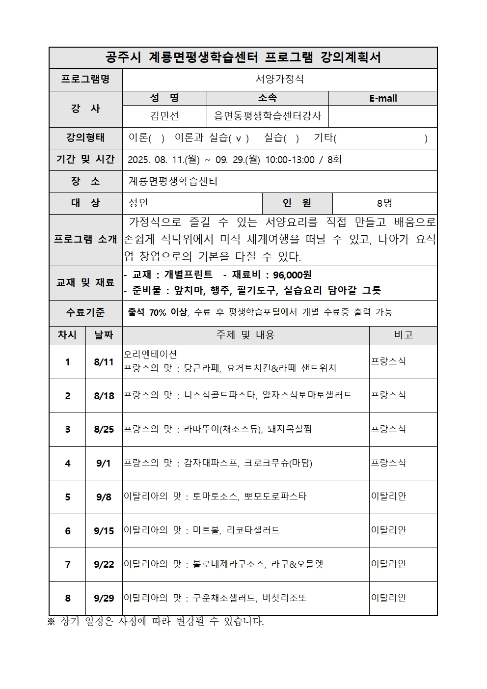강좌명 [계룡면] 서양가정식 교육기간 2025-08-11~ 2025-09-29